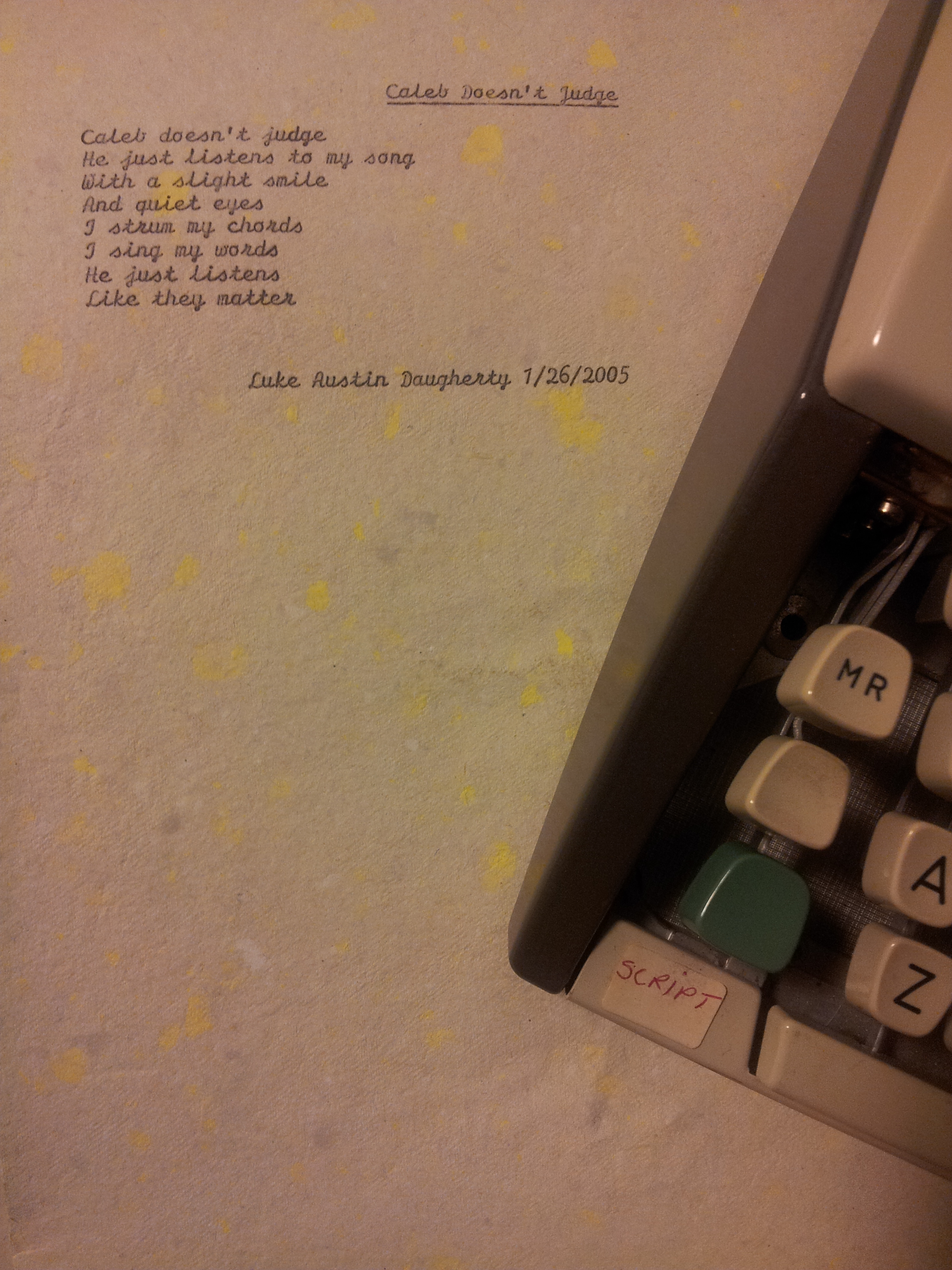 A typecast picture of an original poem by Luke Austin Daugherty, called, “Caleb Doesn’t Judge.” Typed on a vintage Olympia DeLuxe typewriter with script font.